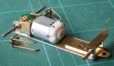 brass was cut, drilled and bent to form a front axle bracket. A piece